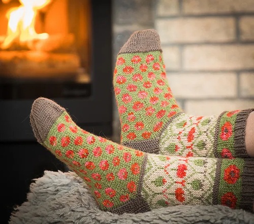 Have a look at these beautiful poppy socks by Cecilie Kaurin and Linn Bryhn Jacobsen. All you need is fingering yarn with a US 1½/2½ needle.