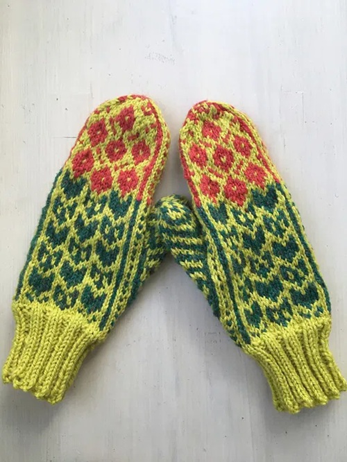 Have a look at these beautiful poppy fingerless mitts by Twisted Classics. The motifs are worked in intarsia methods, and the mitts are worked in plain stocking stitch.