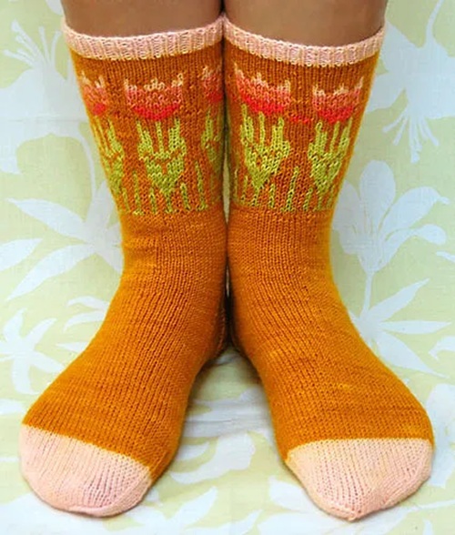 Keep your feet warm in style with these lovely knitted tulip socks by Whitney Van Nes. All you need to use is 100% merino wool yarn with a US 2 double-pointed needle.