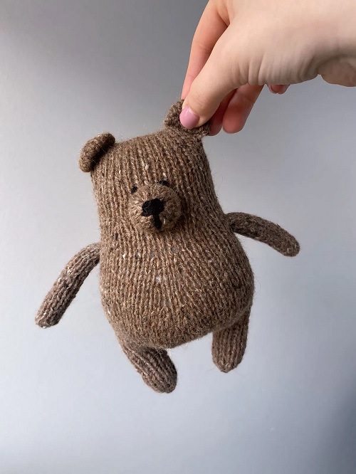 Have a look at this chubby little teddy bear by Maylily Knitting. You can easily make it a video guide. All you need to use is 50 g of yarn with a 1-1.5 knitting needle.