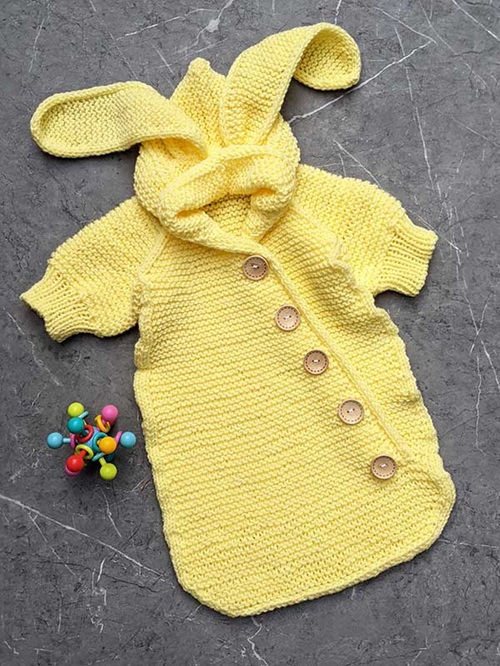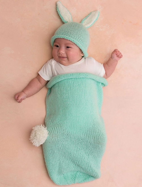 Yarnspirations has knitted a lovely bunny-inspired cocoon for your little one. It comes with the matching bunny-eared hat.