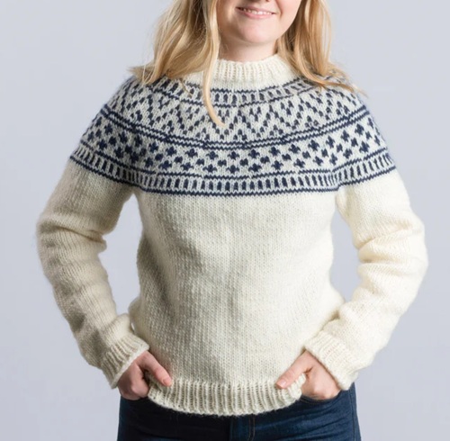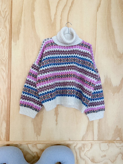 Katharina Müller has designed this beautiful sweater from top to bottom. It’s a lovely combination of fair isle style with a modern Nordic pattern.