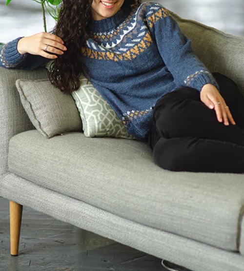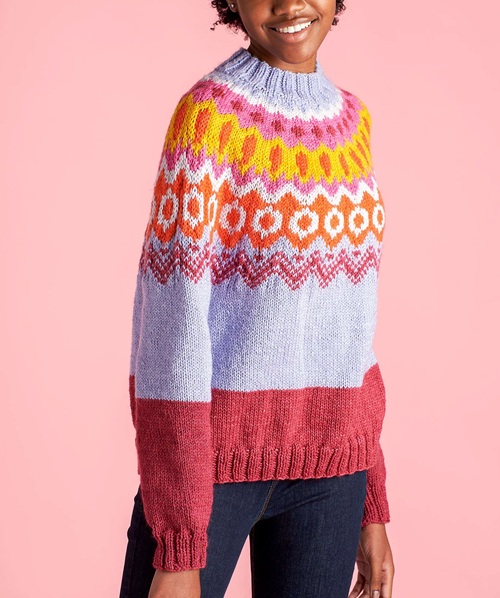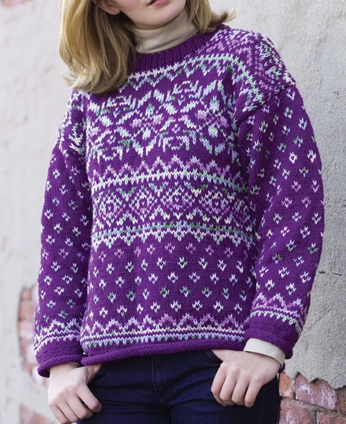 Love lavender color? Then this pullover by Yarnspirations might be the one! It features a classic fair isle pattern with a geometric and floral design.