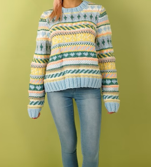 This lovely sweater by Love Crafts is a must-have in your wardrobe. It features classic fair isle motifs in hearts, crosses, and zig zags design.
