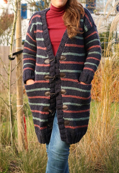 Take a look at this striped oversized cardigan by Hortense. This winterwear is a bit heavier than usual cardigans, so if you want a lightweight one, avoid this.