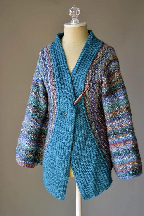 Amy Gunderson is the talented knitter behind this kimono cardigan. It’s created with a gauge of 14 sts x 20 rows = 4″ using straight needles.
