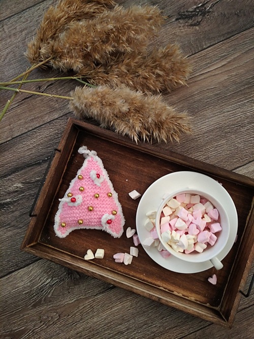 Kino Knits shares a fantastic way to use the leftover yarn. Their colorful design and simple shape will add charm to your Christmas tree.