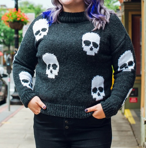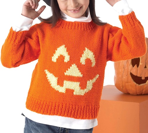 Want a design that feels spooky yet wearable? Then have a look at this sweater by Lion Brand Yarn. You require worsted yarn and a 29″ circular needle.