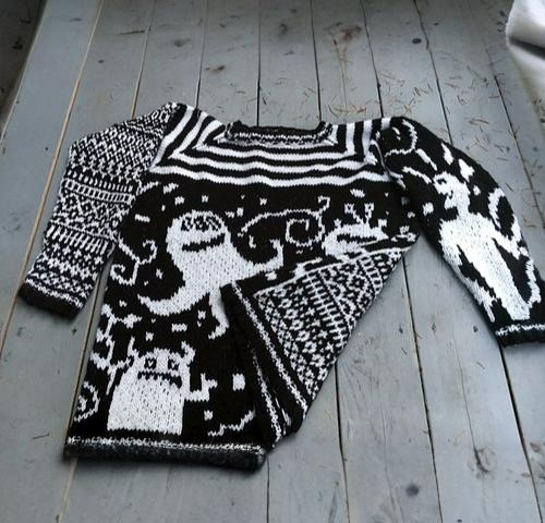 Have a look at this monochrome knitted monster sweater by Kristin Bruckner. It is worked in rounds from the bottom up and finished with simple raglan shaping.