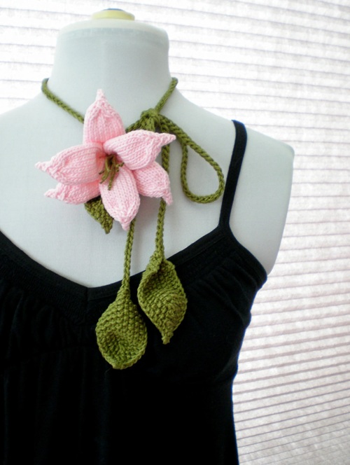 The lily lariat flower necklace by OhmayDIY is a stylish wearable design. It features a detailed lily bloom paired with knitted leaves and a long lariat-style tie.