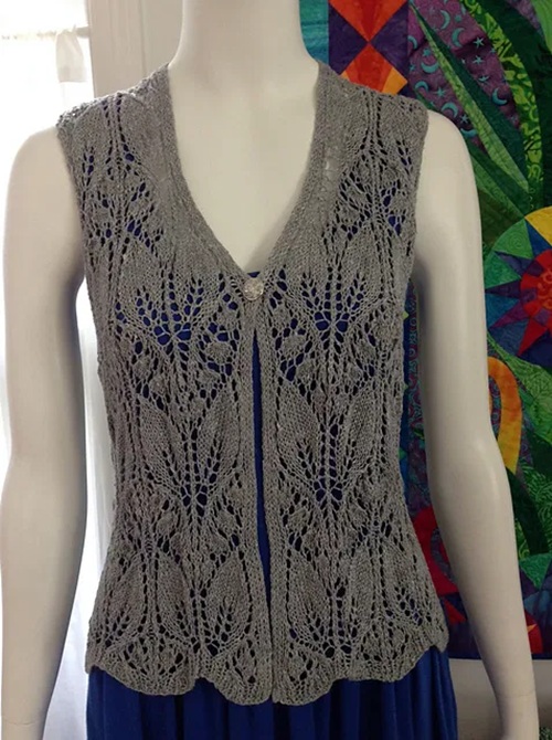 Using yo, ssk, k2tog, kyok, k7tog, k5tog, k4tog stitch, Jeri Riggs has knitted this vest. It features delicate floral motifs inspired by lily shapes. And you can layer it over tops or dresses on any occasion.