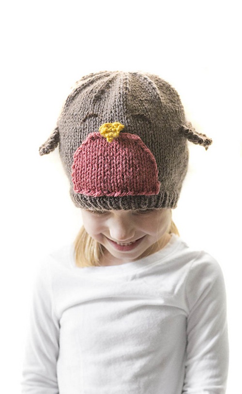 This cute robin hat design is by Littleredwindow. It has a cute robin design on the front. The best part? No ear-knitting required, making it perfect for beginners.