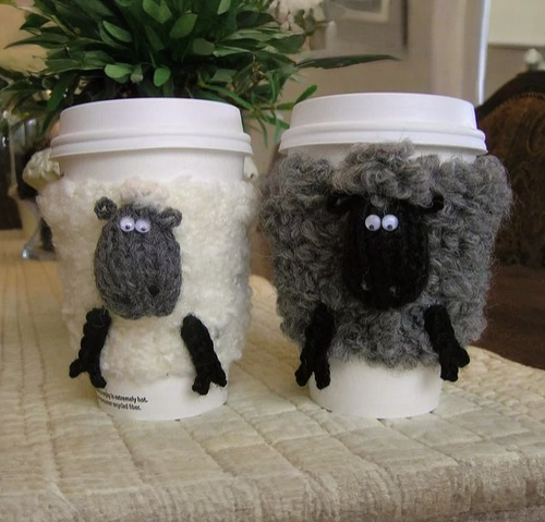 Try out these charming sheep cozies from Denise Jodoin. These cozies are made to fit most small-sized beverage cups that you find easily at a coffeehouse.
