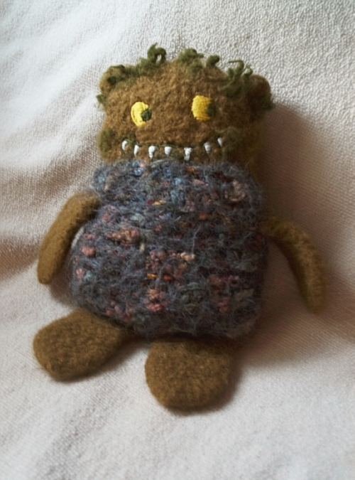 Check out this cuddly teddy critter from Shannon Dunbabin. It’s knitted out of Merino wool yarn, 5.5mm double-pointed needles, safety eyes, and fiberfill.