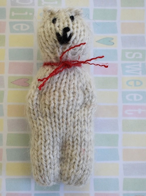Louisa FeltSoapGood made this tiny teddy flat in one piece with 4mm needles, medium-weight yarn, and polyfil stuffing. The small stature and absence of hands earn this teddy a spot in this list.