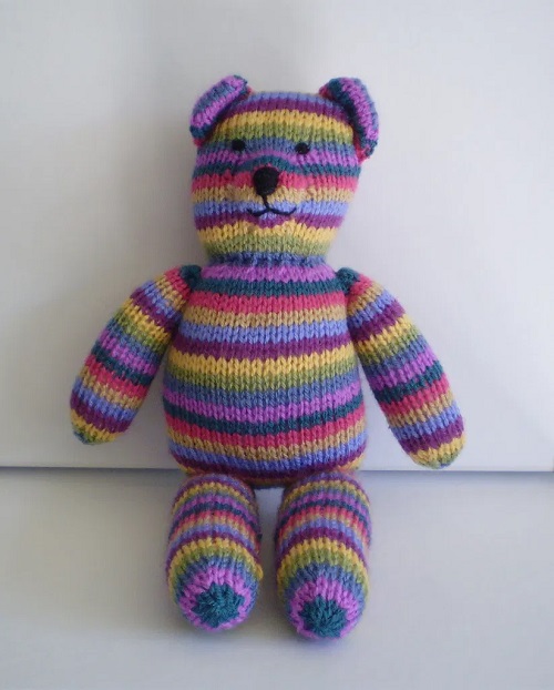 Frankie Brown is the talented knitter behind this weird striped teddy. She used a gauge of 12 stitches and 17 rows = 5 cm in stocking stitch for this project.